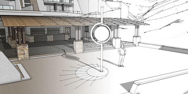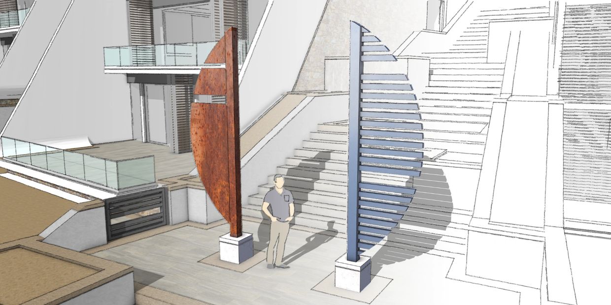 This piece, called "Sun and Moon", was designed to frame the beautiful architecture and natural vistas as you ascend or descend the staircase. The sculpture also acts as a transition piece dividing the private condo spaces from the public beach area.