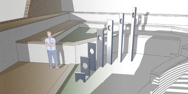 This sculpture is called "Rise". The voids in the aluminum are designed to mimic an abstract sun or moon rise. Each cut out frames and incorporates the surrounding environment. This is what makes our approach different. We don't measure an interior wall or an exterior space and look for any object that will fit it. We create the one, bespoke object for that space. In that way, our designs inhabit a space rather than decorating it.